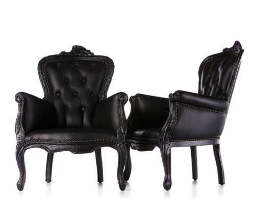 The European chairs, shown here are a Bergere Style that has long been considered cliche. Yet, when presented in a luxurious leather and their distinct frames painted to make them disappear, they tell a different story. A chair as an object, instantly tells the story like a great brand. Picture an entirely empty space in your mind: it can be dominated by the mere selection of a set of chairs that can tell a story or a table, for that matter.